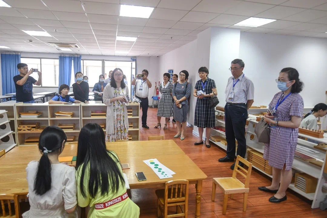 随后,专家组来到了北校区6号楼泥巴影院 实验教学中心3楼,首先走访了奥尔夫教学法实验室。奥尔夫教学法实验室是以奥尔夫音乐教育体系为依托,为学前教育专业提供音乐教学、科研的基地。在实验室里,学院郑晓老师正带着同学们利用各种乐器感受音乐,氛围热情欢乐。接着,专家们又移步至蒙台梭利教学实验室,在实验室里,曹娟老师正带领同学们认真专注地使用着教具。实验室里的蒙台梭利教具包括感官教育教具、数学教育教具、语言教育教具、科学文化教育教具、日常生活教育教具及音乐教育教具等,学生在实验室里可以开展各种教学实践活动、为老师科研活动提供支撑平台等。专家组还对录音实验室、语言工作坊、书法工作坊、科学制作实验室、机器人实验室、自然科学实验室等进行了走访考察。李默老师和金建钰老师分别向专家介绍了书法工作坊的情况和自然科学探究室的情况。