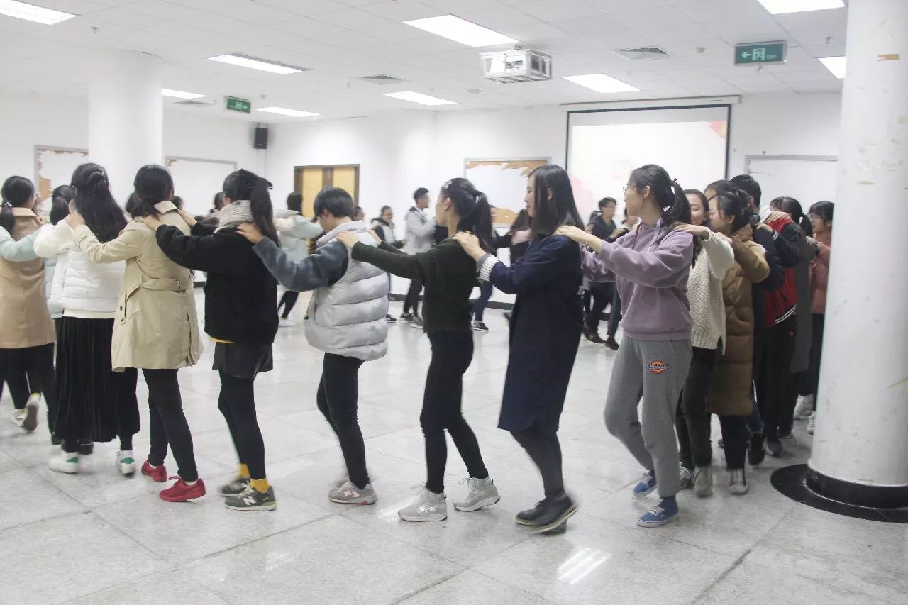第一轮游戏“桃花朵朵开”,为调动团学成员们的参与程度,提高团队的凝聚力,检验大家的反应能力及默契度。在简单进行完身体关节活动以后,伴随着《桃花朵朵开》的音乐所有成员们围成一个圆圈,慢慢跑动起来,吴超智老师会在大家跑动的同时,说出“春天来了,桃花开了”,所有成员齐问“开几朵”,紧接着,超智老师随机喊出一个数字,大家按照数字的大小,迅速的抱在一起,经过几轮紧张而又热烈的比拼之后,最后胜出的一组成员获得到了零食大礼包。