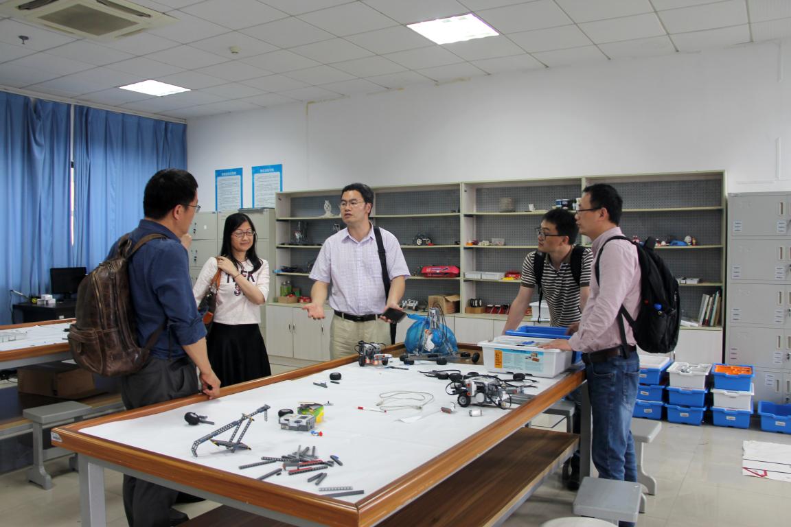 在交流完之后,王永固副院长一行还参观了泥巴影院 实验中心、温大创客空间,实验中心主任李小志、副主任杨健以及张新立、叶爱敏老师热情接待了来访客人。王永固副院长一行主要参观了虚拟实验室、学生工作坊实验室、教育机器人创客空间、温大创客空间等实验室,他们对实验中心宽敞的场地、先进的仪器设备、丰硕的教研成果予以很高的评价,同时,双方就师范类实训实验室的建设情况进行了深度交流与探讨。