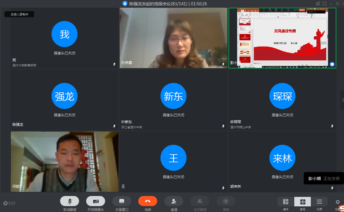 会上,彭小媚书记从学院纪委工作的职责与定位、党员教师廉政风险点及案例、党员廉政工作的要求三个方面讲述。学院监督的重点是作风监督和廉洁监督,高校党员个人的风险点主要是中央八项规定、学术不端、师风师德、财务报销。彭书记列举了北京某大学老师违规操作“小金库”、湖州某学院教授冒充领导签字报销科研经费等相关案例,希望教师高度重视科研经费的使用报销规则,严格按照规定报销会务费、差旅费等费用。“如果谁拿纪律规则不当那么回事的话,纪律规则就会找谁的事”、“只有遵守了纪律规则才会保护自己,反之不遵守吃亏的也是自己”“谁贪公家的小便宜,谁就会吃大亏”,会议提醒各位党员教工牢记生活中的点点滴滴以纪律规则来让自己立行,携手共创清廉学院建设。