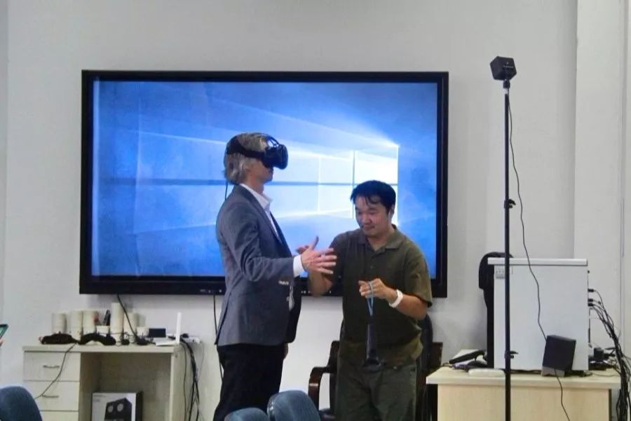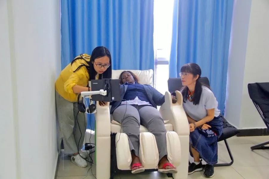 随后,Raquel一行参观了中心团体辅导室、个别咨询室、家庭治疗室、放松催眠室、沙盘辅导室、虚拟现实技术(VR)实验室并亲自体验了放松技术、VR技术。