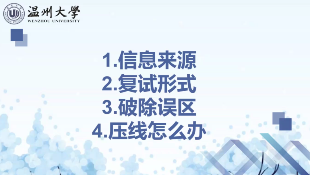 交流会伊始,潘士杰老师就信息来源、复试形式、破除误区、压线怎么办这四个问题展开解读,同时鼓励同学们不要放弃任何希望,做好两手准备,放松心态,积极备考。