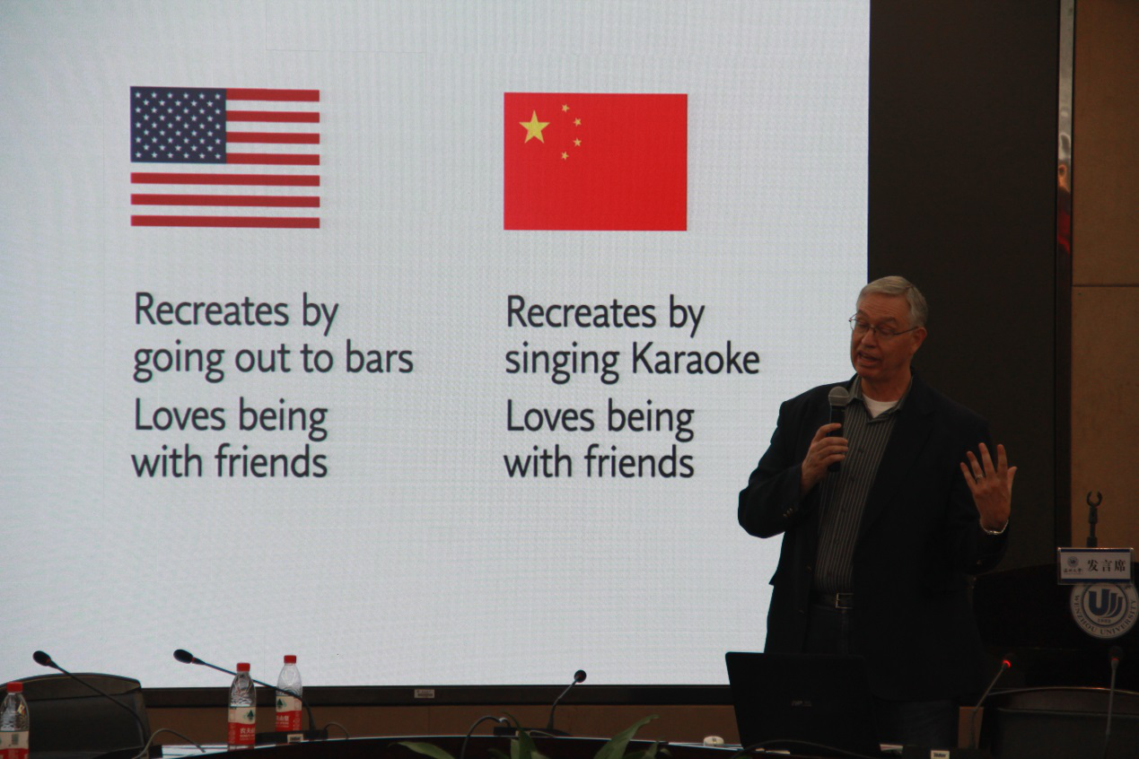 在顺应学校发展趋势中,围绕教育观念国际化、人才培养目标国际化和合作交流国际化等方面进行了教育国际化的有益探索,吸收和借鉴国外教育的先进理念和成功经验,提升学校教育现代化水平和国际交流合作领域,为培养和造就具有国际视野、具有先进理念的国际化师范人才而努力。 学习科学领域主要关注“人为什么要学习”、“人是如何学习的”以及“人应该如何学习才更有效”等三大核心基础性问题展开研究,而且,世界各国已将学习科学确立为新教育政策的关键基础,其成果深刻影响了国际教育变革的步伐和走向。从学习科学出发,研究教与学的关系,已成为世界诸多发达国家探索教育创新、革新课堂教学的新路径选择。本次论坛以“学习科学与教学”为主题,旨在通过学习科学的研究成果推动教学发展,使教育工作者更好的理解学与教的内在逻辑关系。来自肯恩大学Randy L. Clark教授以幽默风趣的开场白揭开了本次论坛的序曲,他主要从视觉可视化图形教学出发,在中国与美国学生在设计图形过程产生的思维差异作为教学研究的切入点,重点改善与优化中国学生可视化图形设计的思维,并认为图形化设计过程就是为了简洁、明了地传递信息,也是为了更加深入地加工信息,是对语言、文字等思维活动的解释说明。 Randy L. Clark教授学术演讲 来自韩国全南大学的Shin. BoMi教授,则主要从数学教育为介绍的出发点,重点探讨了韩国在数学教学、教师知识以及数学电子课本开发等方向的问题。同时,也谈到了全南大学文化特点、中韩两国教育文化的发展,尤其是全南大学与中泥巴影院