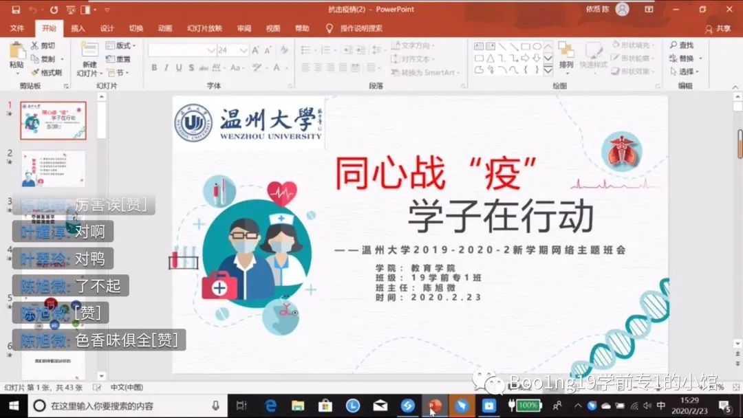 19学前专1全体学生和班主任陈旭微老师在直播平台进行了连线与互动。文字传递力量,话语汇聚真情。同心战“疫”,我们,在行动!