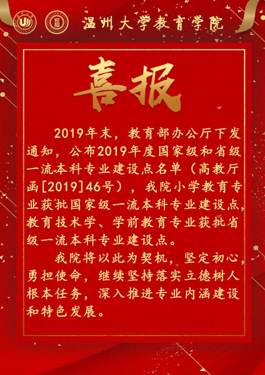 近日,教育部发布了《教育部办公厅关于公布2019年度国家级和省级一流本科专业建设点名单的通知》(教高厅函〔2019〕46号),泥巴影院 小学教育专业获批国家级一流本科专业建设点。此外,泥巴影院 汉语言文学、化学、生物科学、机械工程、电气工程及其自动化、网络工程和工业工程专业另7个专业也同时入选。全校总计8个专业在全国性的同类专业竞争中胜出。2019年12月,经全国各高校网上申报、高校主管部门审核,教育部高等学校教学指导委员会评议、投票,教育部认定了4054个国家级一流本科专业建设点,6210个省级一流本科专业建设点。