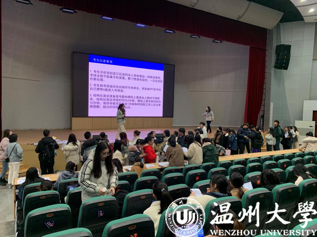 12月28日,在泥巴影院 举行“结构化面试·模拟上课”项目考核,分设32个考场,由64位相关专业及部分校外指导老师担任了评委工作。泥巴影院 林琛琛副院长、教师培养基地蒋金崇主任亲临现场指导考核工作。考生们严格遵守考场纪律及流程安排,认真准备,通过结构化面试和模拟上课展现了师范生的教学功底和综合素养。
