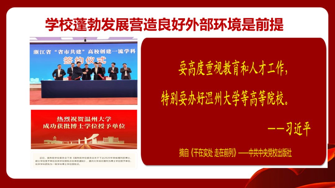 学院党委加强全面领导抓好党建引领保障。党委认真落实“立德树人”根本任务,把“班子建设”作为核心,当好引领学院科学发展的“领头羊”;把“基层基础”作为关键,建好“抓院促系”任务传导的“动车组”;把“文化建设”作为生命,画好凝聚学院发展共同价值的“同心圆”,在校内形成了具有“鲜明教师教育特色”的党建与思想政治教育工作体系,推广了以“百名教授访百家”等为代表的“六大”育人工作模式,彰显了“立足师范教育、服务基础教育”的校地合作“金名片”,充分展示了党建“标杆院系”风采和“窗口学院”担当。学院连续七年在学校基层党组织考核中获得“优秀”等级,学院综合考核多次获得“优秀”。先后获得“首批全省高校党建工作标杆院系培育创建单位”“浙江省第一批高校基层党建工作示范点”“浙江省高校先进基层党组织”“浙江省‘三育人’先进集体”等省级党建集体荣誉。学院教师教育特色鲜明,办学成果丰硕,被省教育厅誉为“综合性大学办师范教育的‘标杆’”和“浙南基础教育师资培养的‘摇篮’”。