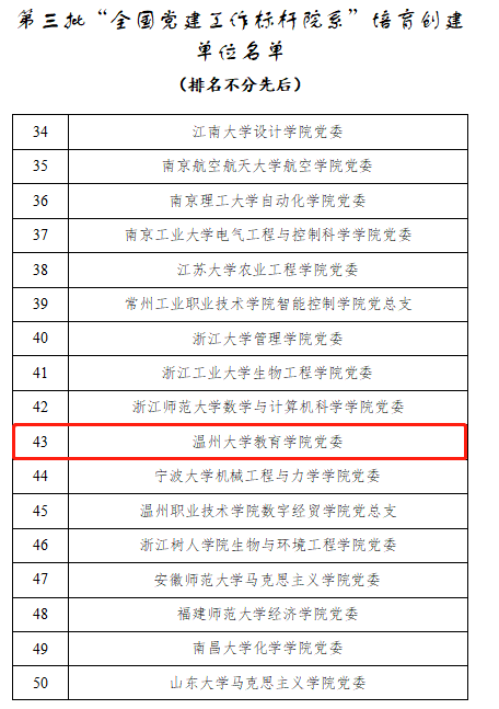 近日,教育部办公厅发布《关于公布第三批全国党建工作示范高校、标杆院系、样板支部培育创建单位名单的通知》,泥巴影院 党委成功入选第三批“全国党建工作标杆院系”培育创建单位,这是继泥巴影院 获评“首批全省高校党建工作标杆院系培育创建单位”“浙江省第一批高校基层党建工作示范点”“浙江省高校先进基层党组织”“浙江省‘三育人’先进集体”等省级党建集体荣誉之后,学院获得的国字号党建集体荣誉。