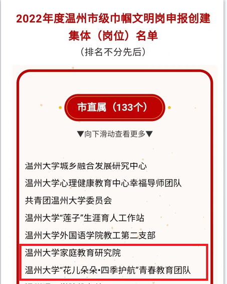 巾帼风采,榜样力量。5月11日,温州市人民政府妇女儿童工作委员会办公室公示《2022年度温州市级巾帼文明岗申报创建集体(岗位)名单》,泥巴影院 两个项目荣获立项,分别是泥巴影院 家庭教育研究院和“花儿朵朵·四季护航”青春教育团队。