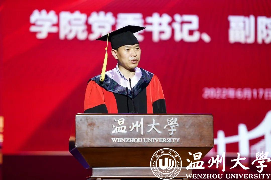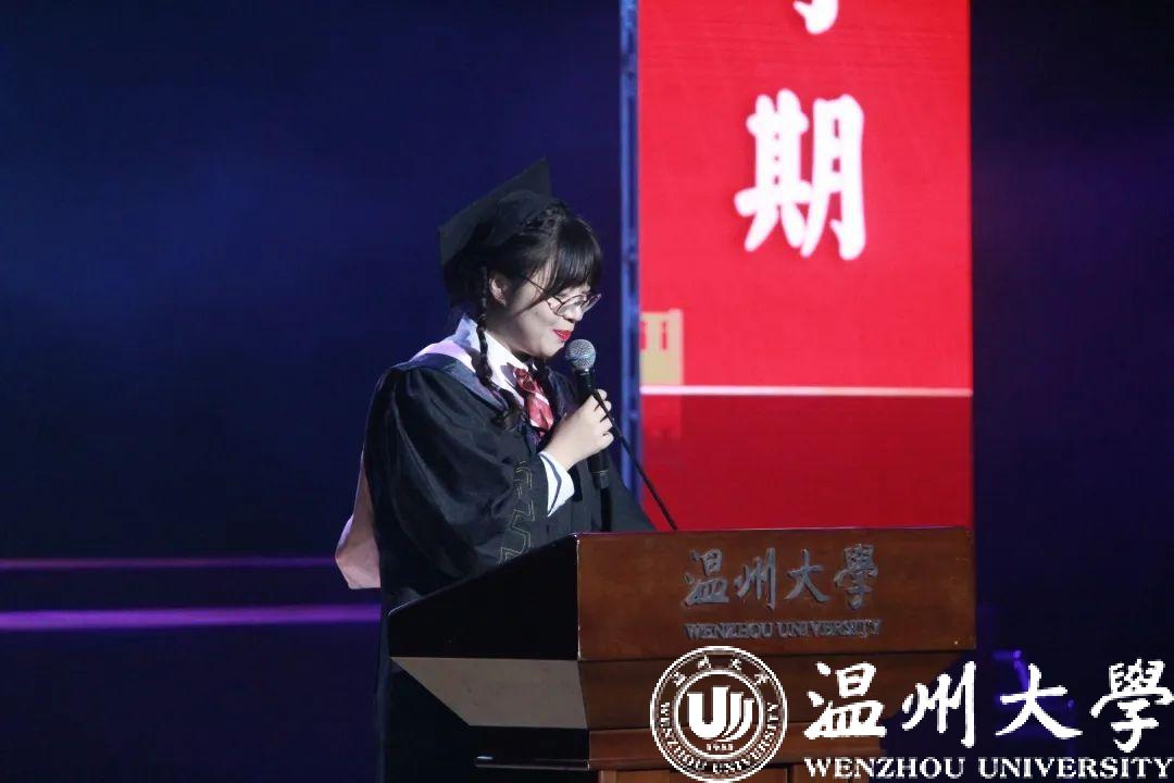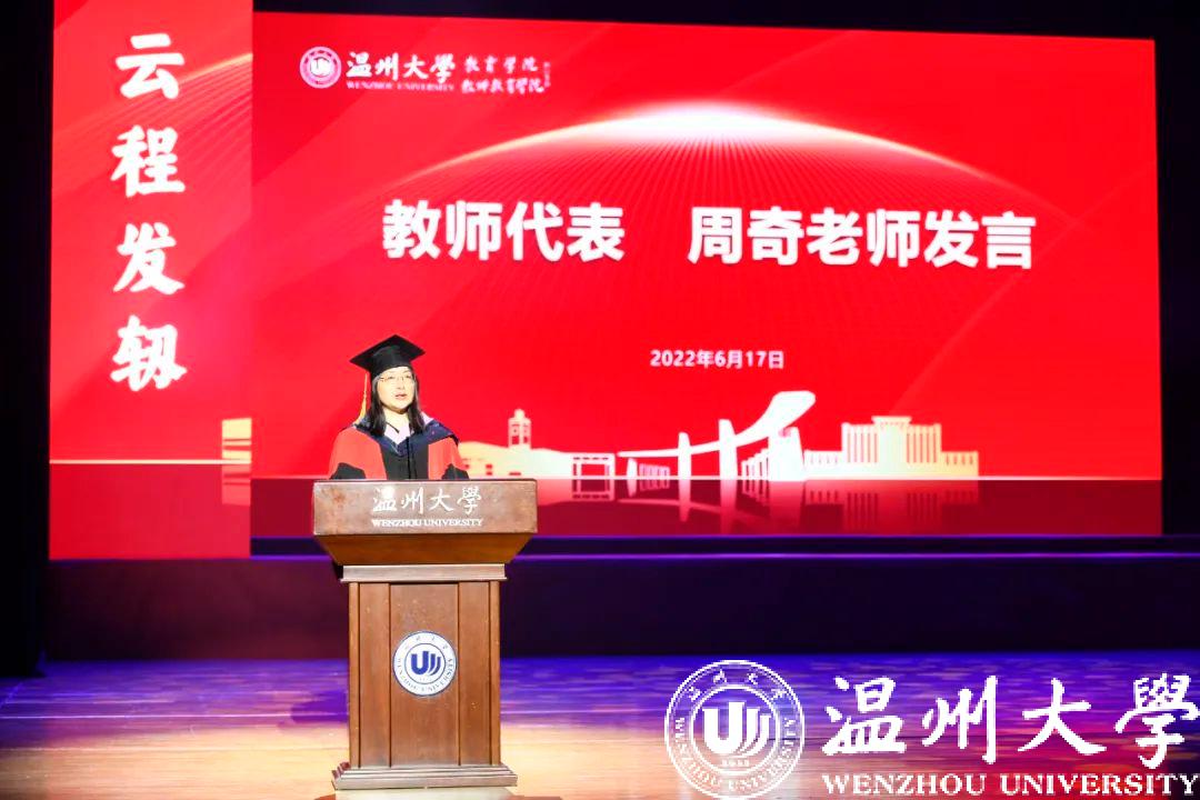 全国家庭工作先进个人、浙江省巾帼建功标兵周奇老师作为教师代表发言。她寄语毕业生们三句话:第一,不忘初心,博爱雅艺;第二,学会感恩,心存大爱;第三,多彩人生,矢志奋斗。惜别且珍惜,前程壮而美,离别在即,数年深厚师生情谊令人十分难舍。她激励同学们始终保持以诚待人、正直善良、勤奋担当的品质,懂得感恩,愿意奉献,成为心中有梦、眼中有光、脚下有路的人;希望所有毕业生成人、成才、成功,无论身在何处,都记得常回学院看看。