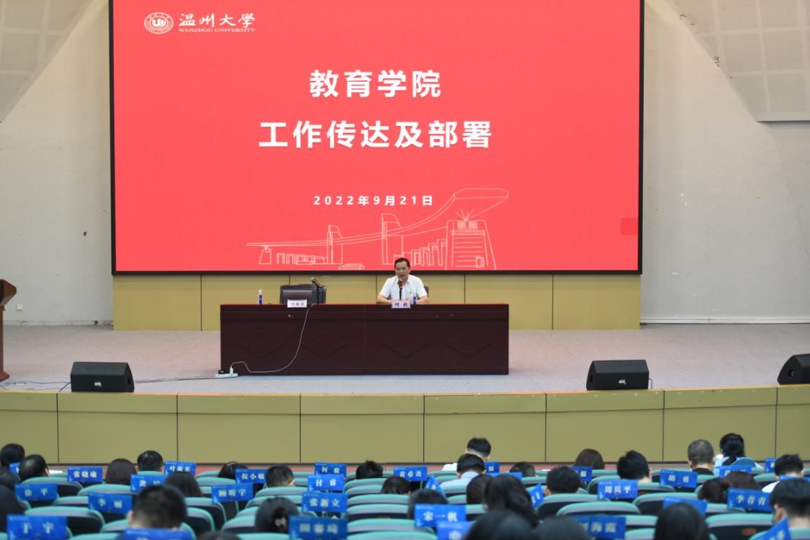 理论学习报告会后,学院副院长叶新东传达了学校新学期教学工作会议精神。他从人才培养体系、专业内涵发展、课程质量提升、教材管理体系、学科竞赛管理、国际化课程等十大重点工作以及教师教学发展、基层教学组织、教学质量监控、教师教学激励和数字平台升级五大工作模块对学校教学工作会议精神进行了梳理与解读。