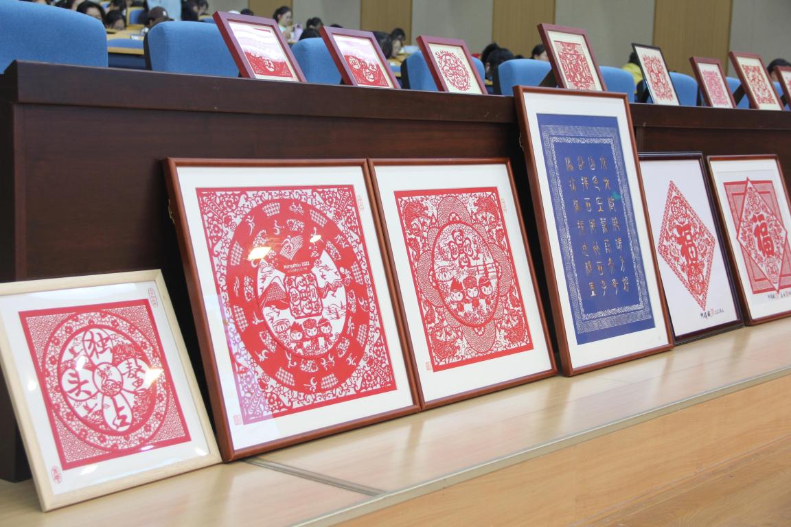 柯娟娥老师向同学们详细讲解了太平钿剪纸的 “前世今生”,并分享了自己与剪纸艺术深厚情缘。姜云老师结合部分作品分享剪纸的创作过程和灵感来源,她还强调在传统技艺创作中要不断融入时代元素,并展示了团队创作的建党百年、杭州亚运、冬奥会等主题作品。柯老师团队还带来了代表作品供师生鉴赏。一幅幅太平钿剪纸作品展现在同学们面前,纹样栩栩如生,堪称视觉盛宴。太平钿剪纸赋予了一张纸不平凡的寓意,传递了创作者最真挚的感情。