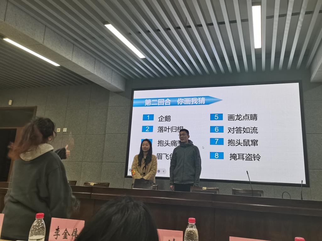 现场硝烟四起,选手们准备充分、认真作答,气氛紧张而热烈,精彩的回答不时博得观众的阵阵掌声。其中一支“今日宜加油”队拔得头筹。 “今日宜加油”队由泥巴影院 21专硕2班金婷婷、王智静以及人文学院21学科语文沈丽楠三人组成。金婷婷同学表示,他们三人虽不是同一个学院,但因为经常凑在一起读书和学术交流而结识。“这不仅是一次知识竞赛,更是一次学习的机会。”金婷婷表示, 三人平时阅读书目涉猎广泛,经常留心观察身边的细小问题,也因此将学习融入日常生活,而这便是她们的“制胜密码”。在第一场淘汰赛中,“今日宜加油”队一马当先连续答对十题,在“你画我猜”环节更是表现出了惊人的默契,引得观众一片惊呼。
