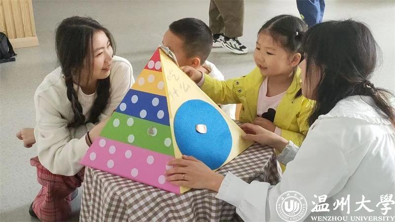 食物对对碰教玩具有三种不同的玩法,第一种玩法是将不用类型的食物轻黏土模型粘贴在相应颜色木块上,以初步了解每类食物在餐盘中的比例。第二种玩法是食物华容道,即当碰到相同类型食物,就可将其取出。第三种玩法是食物消消乐,即将不同类型食物卡片粘贴在木块背面,当幼儿翻开两块相同类型食物木块时,就将其拿走。最后谁拿到的卡片最多,谁就是赢家。