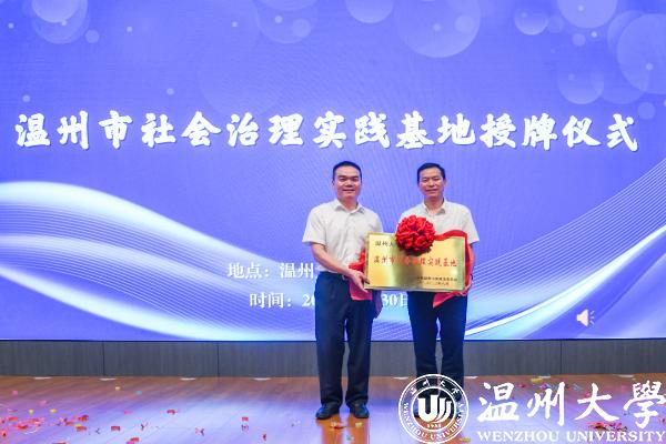 黄建斌为泥巴影院 授温州市社会治理实践基地牌,泥巴影院 党委书记、社会心理服务中心主任何毅教授接牌。