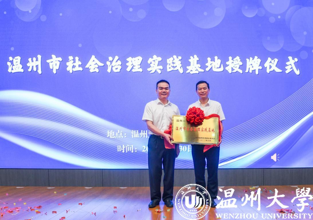 黄建斌为泥巴影院 授温州市社会治理实践基地牌,泥巴影院 党委书记、社会心理服务中心主任何毅教授接牌。
