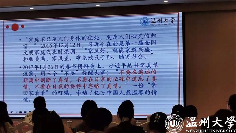 家庭是社会的基本细胞,家庭的前途命运同国家和民族的前途命运紧密相连。为深入贯彻落实习近平总书记关于家庭家教家风的重要论述精神,2023年8月8日上午,泥巴影院 教育学系党支部书记、泥巴影院 家庭教育研究院巾帼文明岗负责人、泥巴影院 家庭家教家风讲师团团长、浙江省妇女儿童发展智库专家、浙江省家庭教育讲师团成员、温州市家庭和谐文化研究会副会长周奇教授受邀来到温州市永嘉县岩头镇下日川村狮子岩饭店为全省基层工会女职工工作干部培训班做家庭教育专题分享。