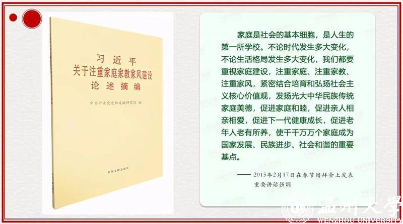 周老师以《传承优良家风,学做智慧父母》为题为大家带来了一场家风传承讲座。讲课伊始,周老师引用2015年春节团拜会上,习近平总书记强调:“不论时代发生多大变化,不论生活格局发生多大变化,我们都要重视家庭建设,注重家庭、注重家教、注重家风,发扬光大中华民族传统家庭美德。”“三个注重”要求既是家庭建设的重点,也是新时代我国家庭教育的行动指南。