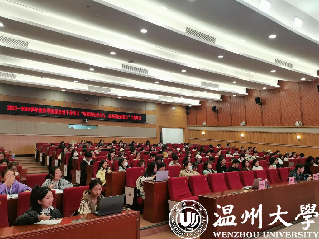 11月16日晚,温大泥巴影院 在育英图书馆二楼报告厅开展主题为“明德致远爱先行,汲汲微茫润初心”的团干培训活动,特邀全国劳模、浙江省雪君理论宣讲名师工作室负责人郑雪君主讲《让心中的太阳升起》的励志课。全院团学骨干近270人参与。