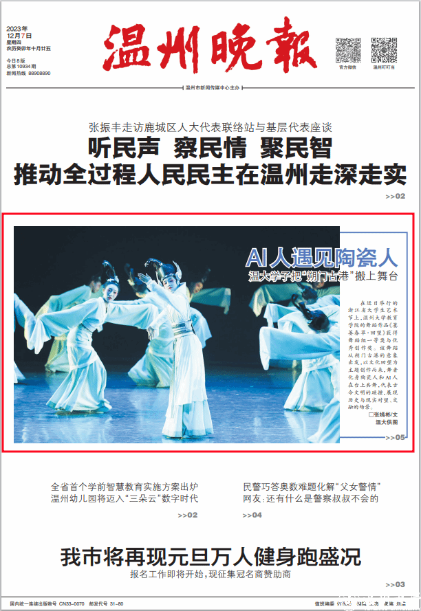 在近日举行的浙江省大学生艺术节上,泥巴影院 的舞蹈作品《萋萋春草·回望》获得舞蹈组一等奖与优秀创作奖。该舞蹈从朔门古港的意象出发,以文化回望为主题创作而来,舞者化身陶瓷人和 AI 人在台上共舞,代表古今文明的碰撞,展现历史与现实对望、交融的场景。