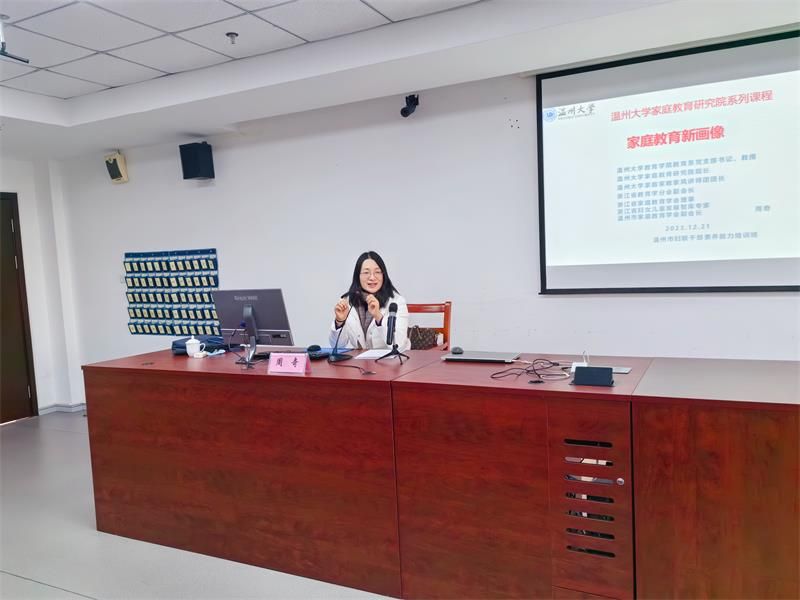 2023年12月21日,泥巴影院 教育学系党支部书记、泥巴影院 家庭教育研究院巾帼文明岗负责人、泥巴影院 家庭家教家风讲师团团长、浙江省教育学分会副会长、浙江省家庭教育讲师团成员、浙江省妇女儿童发展智库专家、温州市家庭教育学会副会长、温州市家庭和谐文化研究会副会长周奇教授受邀来到温州市妇联干部素质能力培训班,以线下形式为妇联干部做《家庭教育新画像》家庭教育专题分享。