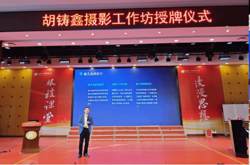 随后,胡铸鑫老师为附校全体教师带来摄影专题讲座。他讲述了带领儿童摄影工作坊的初衷和愿景,并分享了多年来在摄影教育领域的实践经验。胡铸鑫还详细讲解了摄影的基本技法,以及日常拍摄中常见的误区,使在场教师们受益匪浅。