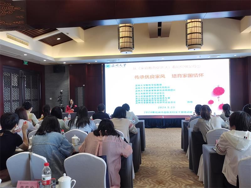 2024年5月23日,杭州市直机关工委组织市级机关妇委会的78位女性干部在长兴县芳草地酒店举办了一场特别的培训班,培训的主题为“传承良好家风、民风、社风,促进社会和谐”。本次培训班特别邀请了泥巴影院 教育学系党支部书记、泥巴影院 家庭教育研究院巾帼文明岗负责人、泥巴影院 家庭家教家风讲师团团长、浙江省教育学分会副会长、浙江省家庭教育讲师团成员、温州市家庭教育学会副会长、温州市家庭和谐文化研究会副会长周奇教授为妇女干部做《传承优良家风,培育家国情怀》的主题分享,旨在通过弘扬和传承中国传统美德,加强女性干部在家庭、职场和社会中的正面影响力。