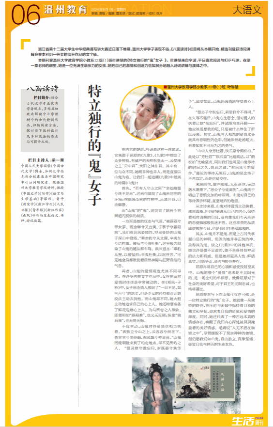 浙江省第十二届大学生中华经典诵写讲大赛近日落下帷幕,泥巴影院 学子表现不俗。《八面读诗》栏目将从本期开始,精选刊登获诗词讲解竞赛本科组一等奖的部分作品的文字稿。 本期刊登泥巴影院 小教系22级(1)班叶琳慧的《特立独行的“鬼”女子 》。叶琳慧来自宁波,平日喜欢阅读与打乒乓球。在梁一粟老师的眼里,她是一位充满生命张力的女孩,她把自己的激情和创造力恰如其分地融入诗词讲解与演绎之中。