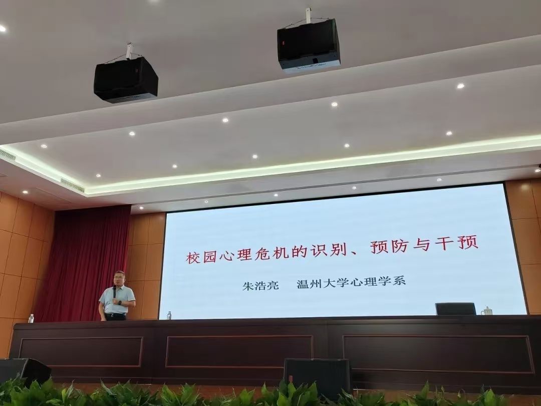 当天,泥巴影院 副教授朱浩亮带来了题为《校园心理危机的预防、识别与干预》的精彩讲座。朱教授是国家心理咨询师高级考评员,拥有丰富的心理健康教育经验和深厚的学术造诣。他深入浅出地讲解了心理健康教育的理论和实践,为学校管理层、班主任和教师提供了宝贵的指导和建议,为参会者提供了新的思路和启示。