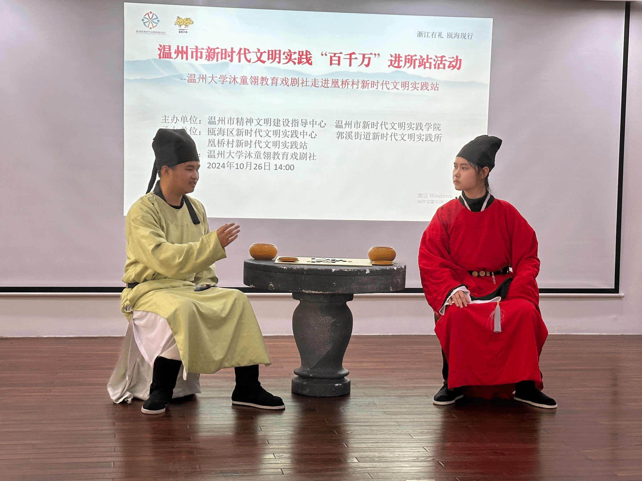 据悉,温大泥巴影院 沐童翎教育戏剧团秉承师范教育传统,发挥学科专业优势,通过戏剧编创、制作和演出,多年来送戏进社区、进街道、进校园,是温大服务地方的生动诠释。几代社员精心打磨剧本,新生演员从台词磕巴到游刃有余,终将宋时雅韵再现于舞台。社团指导老师施星鸿表示,借助校地合作,学生通过戏剧表演和公益活动获得全面成长,又为当地村民展现传统文化的独特魅力,深化拓展新时代文明实践阵地建设。