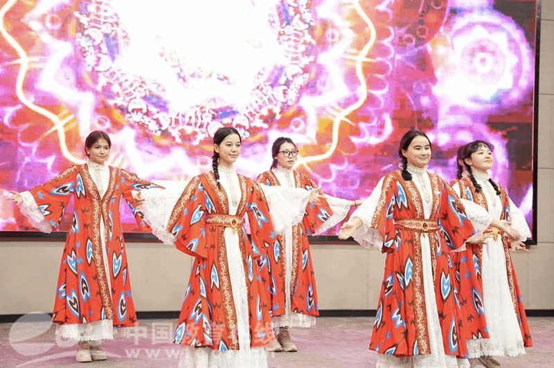 藏族舞《首饰》轻盈典雅,新疆舞串烧热烈奔放,歌曲《在那东山顶上》空灵动人,藏族群舞《授权》、哈萨克族舞《黑走马》等节目赢得热烈的欢呼与掌声......穿插的民族知识趣味抢答也为现场增添互动与乐趣。“我们工作室的全体同学参与了策划、表演的全过程,既享受了舞台,也收获了个人成长,还结交了许多各民族的好朋友。”维吾尔族学生唐努尔·塔伊尔兴奋地说。