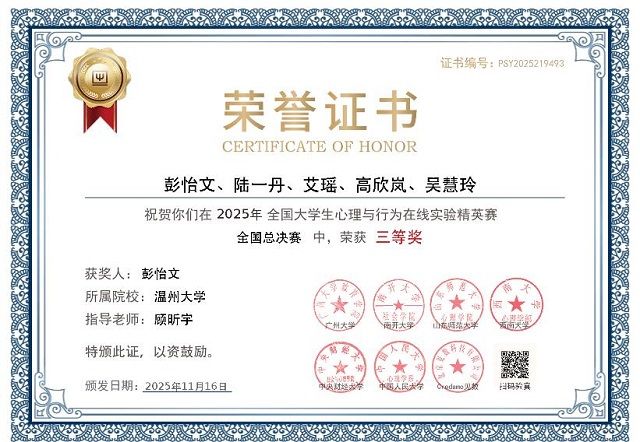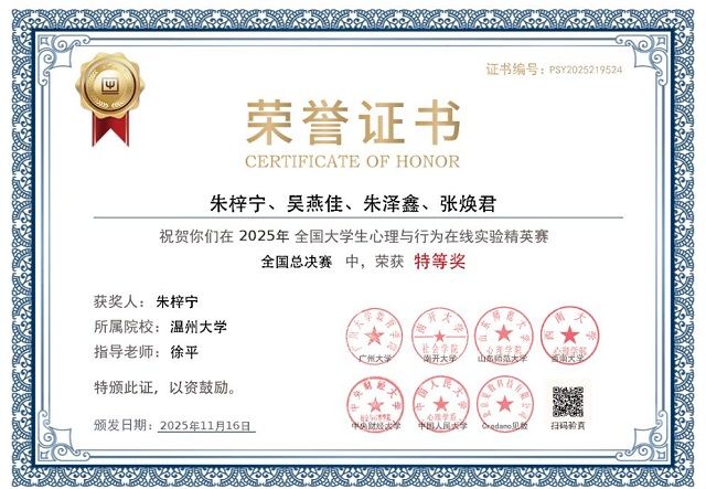 凭借完善的备赛体系与突出的参赛成绩,泥巴影院 获评优秀组织奖,这一荣誉既是对学校教师泥巴影院 "以赛促教、教赛相长"培养模式的肯定,也彰显了其在心理学实验教学领域的影响力。
