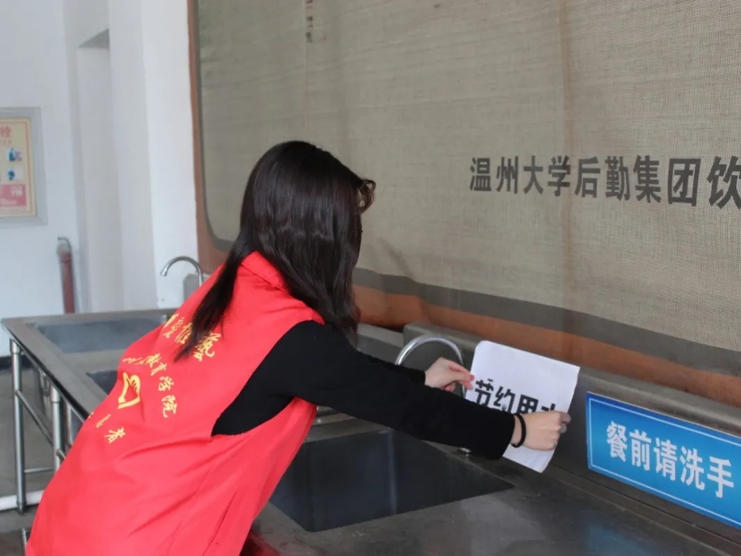 节约用水并非一朝一夕,为使节水理念深入校园,志愿者们分散到各个生活区的食堂、商场内,在洗手台、走廊等醒目处张贴节约用水标志,让节水一词不离生活,触手可及,提醒同学们在日常生活中做到珍惜点滴。