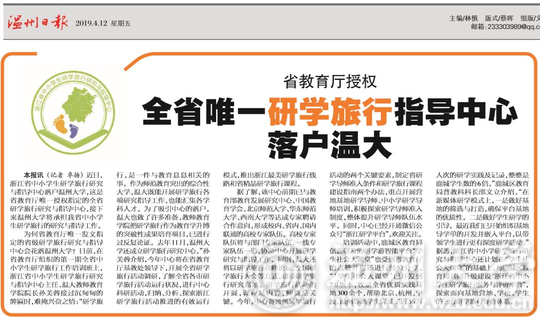 为何省教育厅唯一发文指定的省级研学旅行研究与指导中心会花落泥巴影院 ?日前,在省教育厅组织的第一期全省中小学生研学旅行工作培训班上,浙江省中小学生研学旅行研究与指导中心主任、温大教师泥巴影院 院长孙芙蓉接过沉甸甸的牌匾时,难掩兴奋之情:“研学旅行,是一件与教育息息相关的事。作为师范教育突出的综合性大学,温大既能开展研学旅行各项研究指导工作,也能汇集各学科人才。为了吸引中心的落户,温大也做了许多准备,教师泥巴影院 把研学旅行作为教育学升博的突破性成果培育项目,已进行过反复论证。去年11月,泥巴影院 还成立研学旅行研究中心。”孙芙蓉介绍,今年中心将在省教育厅基教处领导下,开展全省研学旅行活动调研,了解全省各市研学旅行活动运行状况,进行中心科研活动,归纳、分析、探索浙江研学旅行活动推进的有效运行模式,推出浙江最美研学旅行线路和省精品研学旅行课程。