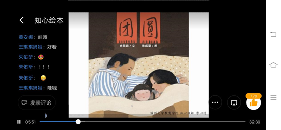 在录制绘本的过程中,实践队员们充分结合专业知识并发挥特长,同时融入巧思,结合音乐、手工、游戏、绘画等元素,为小朋友们讲述了一个又一个生动有趣的故事。依据马斯洛的需求层次理论,人具有爱与归属的需要,而这一点在绘本《团圆》中则有充分的体现。为了帮助儿童了解自身对于家庭的归属需要以及对家人给予的爱的需求,去充分感受家的温暖,知心团队将其纳入平台的课程。《团圆》录制者李心迪同学分享道:“《团圆》是我录制的第一个绘本故事。这个故事的对话是比较少的,主要以旁白为主。因此在讲的时候语气和情绪的变化很重要,需要加上一些肢体动作,要不然,小朋友可能会觉得很枯燥。同时绘本除了故事内容还有一方面就是图片,我们得仔细地观察每一页图片,针对其中的一些小细节进行适当地引导一下,向小朋友抛出一些问题。”