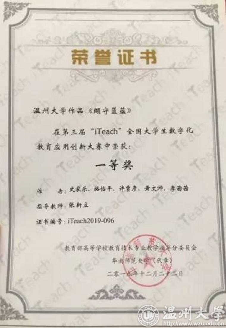 同时,在第三届“iTeach”全国大学生数字化教育应用创新大赛中,由张新立老师指导的学院学生作品《缬守蓝蕴》喜获课程类一等奖。大赛规程严谨,规模盛大,吸引了来自全国各个地区118所高校,1553支团队,6000多名学生参加比赛,参加现场决赛的作品有307项,《缬守蓝蕴》创作小组得到现场专家评委的高度赞扬:“泥巴影院 学生的表现真好!很用心!看到了温州精神!”