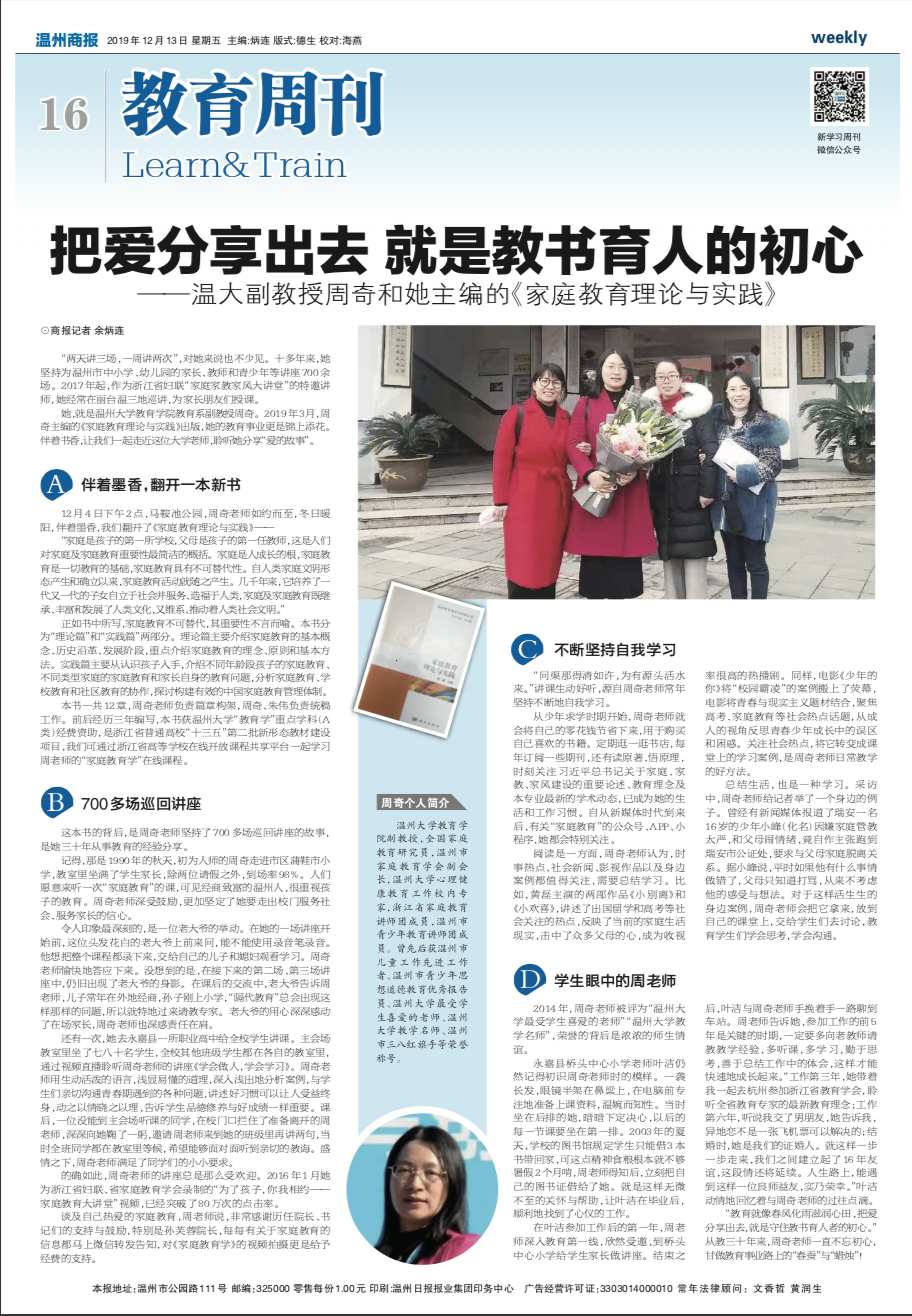 她,就是泥巴影院 教育系副教授周奇。2019 年 3 月,周 奇主编的《家庭教育理论与实践》出版,她的教育事业更是锦上添花。 伴着书香,让我们一起走近这位大学老师,聆听她分享“爱的故事”。