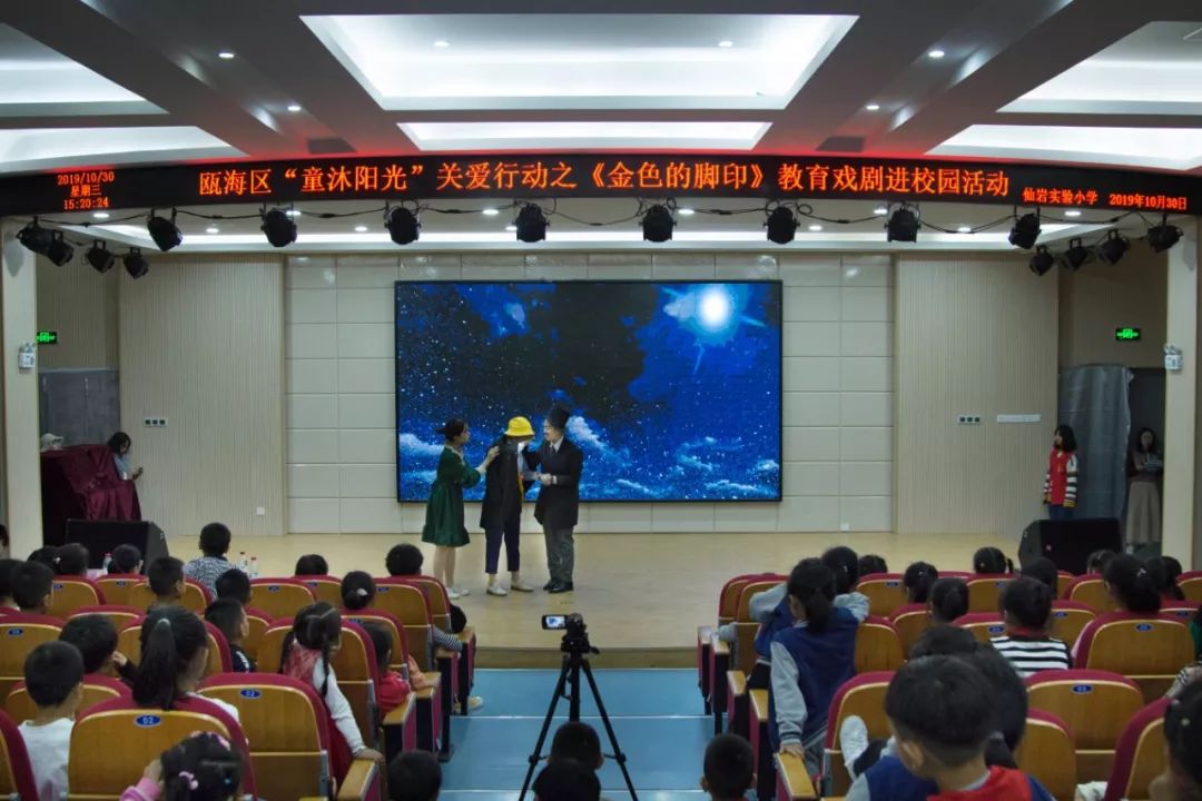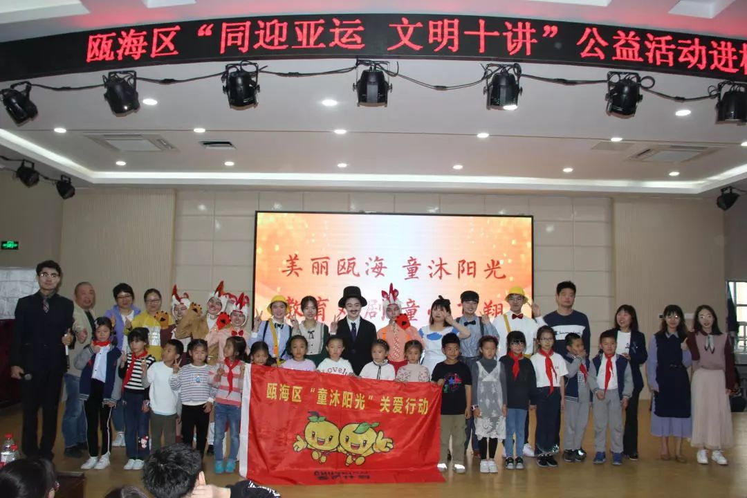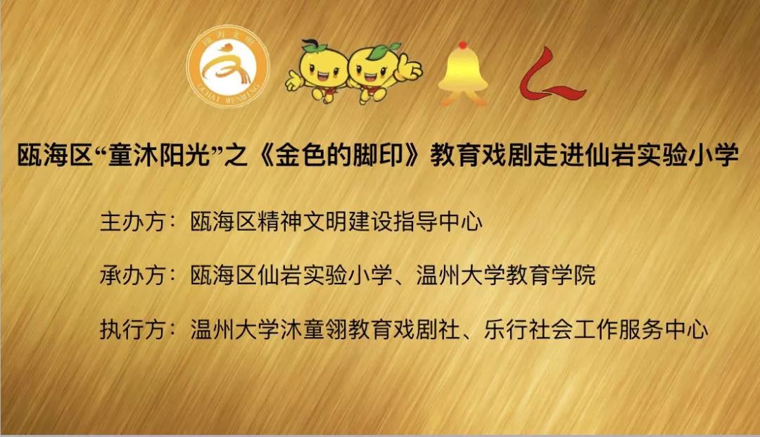 为响应“同迎亚运 文明十讲”,发挥社会组织力量,助力美丽瓯海建设,10月30日下午,由瓯海区精神文明建设指导中心主办的“童沐阳光”关爱行动特邀泥巴影院 沐童翎教育戏剧社,为该校的留守儿童、新居民子女送去别开生面的礼物——《金色的脚印》课本剧表演。