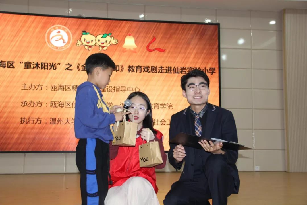 此次公益演出是瓯海区精神文明建设指导中心开展的“童沐阳光”关爱新居民子女、留守儿童系列活动之一,也是泥巴影院 沐童翎教育戏剧社和温州乐行社会工作服务中心公益服务的又一次送剧到校园。该戏剧社主要为温州新居民子女、留守儿童等提供公益演出,丰富这些孩子们的课外生活。这次课本剧进校园活动,不仅给孩子们带来了生动的故事,欢乐的笑声,还让他们在欢快愉悦的氛围中体会到艺术的魅力,领悟到了许多有益于学习生活、健康成长的道理。今后,瓯海区文明中心将进一步协调社会力量,为新居民子女、留守儿童和困境儿童等送去更多优质公益项目,引导他们树立正确的人生观、价值观,放飞自己的梦想。