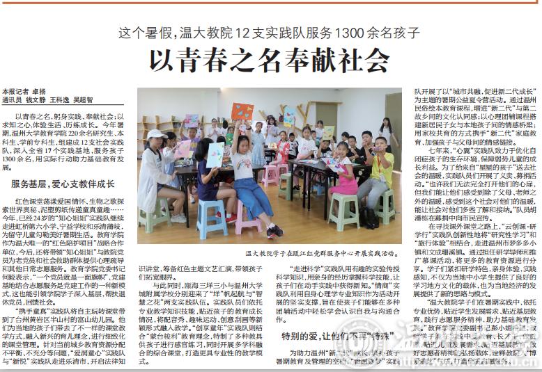 红色课堂荡漾爱国情怀、生物之歌探索世界奥秘、泥塑剪纸传递童真童趣……今年,已经24岁的“知心姐姐”实践队继续走进虹桥第六小学、宁益学校和乐清蒲岐,为留守儿童勾勒美好暑期生活。泥巴影院 作为温大唯一的“红色陪护项目”战略合作单位,今后,还将带领“知心姐姐”与教院党员为老党员和社会救助群体提供心理疏导和其他日常志愿服务。泥巴影院 党委书记何毅表示,“一个党员就是一面旗帜”,党建基地结合志愿服务是党建工作的一种新模式,这也能引领学院学子深入基层,帮扶退休党员,回馈社会。
