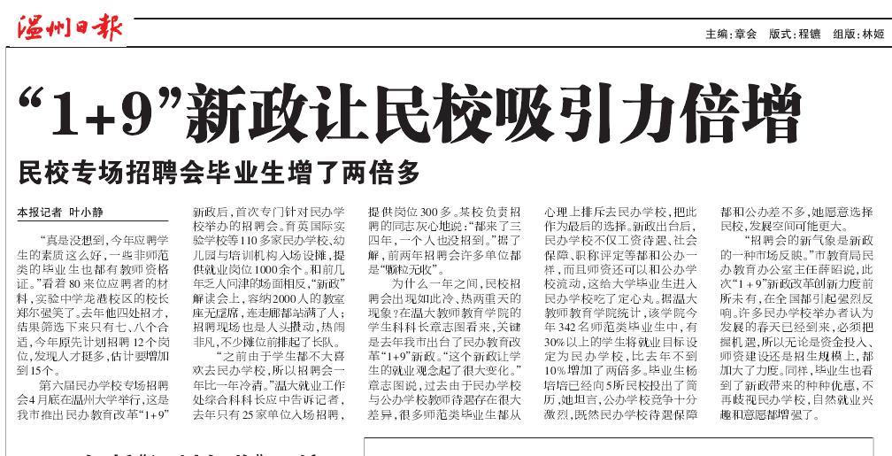 的学生科科长章志图看来,关键是去年我市出台了民办教育改革“1+9”新政。“这个新政让学生的就业观念起了很大变化。”章志图说,过去由于民办学校与公办学校教师待遇存在很大差异,很多师范类毕业生都从心理上排斥去民办学校,把此作为最后的选择。新政出台后,民办学校不仅工资待遇、社会保障、职称评定等都和公办一样,而且师资还可以和公办学校流动,这给大学毕业生进入民办学校吃了定心丸。据温大教师泥巴影院