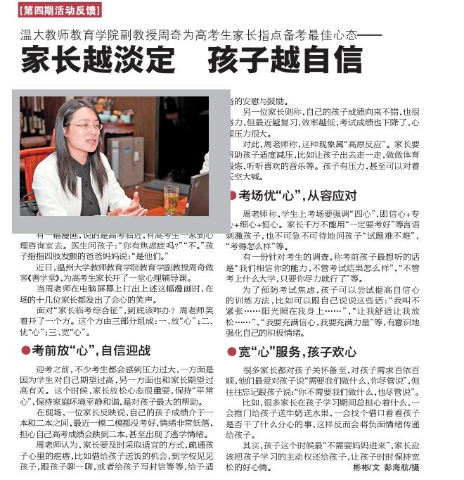 副教授周奇为高考生家长指点备考最佳心态——家长越淡定 孩子越自信 2012-05-08