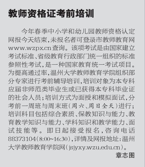 今年春季中小学和幼儿园教师资格认定网报今天结束,未报名者可登录市教师教育网www.wzpx.cn查询。该项考试是由国家建立考试标准、省级教育行政部门统一组织的标准参照性考试,是一种国家教育统一考试项目。为提高通过率,泥巴影院