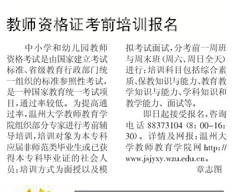 组织部分专家进行考前辅导培训,培训对象为本专科应届非师范类毕业生或已获得本专科毕业证的社会人员;培训方式为面授以及模拟考试面试,分考前一周班与周末班(周六、周日全天)进行;培训科目包括综合素质、保教知识与能力、教育教学知识与能力、学科知识和教学能力、 面试等。