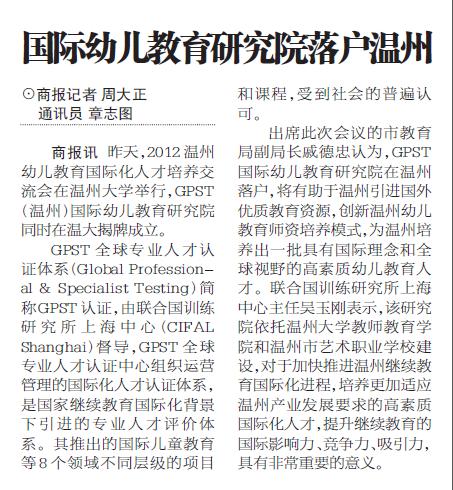 举行,GPST(温州)国际幼儿教育研究院同时在温大揭牌成立。GPST全球专业人才认证体系(Global Professional & Specialist Testing)简称GPST认证,由联合国训练研究所上海中心(CIFAL Shanghai)督导,GPST全球专业人才认证中心组织运营管理的国际化人才认证体系,是国家继续教育国际化背景下引进的专业人才评价体系。其推出的国际儿童教育等8个领域不同层级的项目和课程,受到社会的普遍认可。出席此次会议的市教育局副局长安晋认为,GPST国际幼儿教育研究院在温州落户,将有助于温州引进国外优质教育资源,创新温州幼儿教育师资培养模式,为温州培养出一批具有国际理念和全球视野的高素质幼儿教育人才。联合国训练研究所上海中心主任吴玉刚表示,该研究院依托泥巴影院