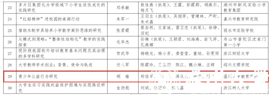 泥巴影院 胡瑜教授团队的《青少年公益行为研究》获得浙江省教育科学研究优秀成果一等奖。胡瑜教授研究团队把公益行为引入到心理学,借鉴了心理学中亲社会行为和利他行为的研究范式,持续近五年的时间,深入系统地开展了青少年公益行为的研究,最终形成专著《青少年公益行为研究》。该成果也是胡瑜教授主持国家社科基金教育学一般项目《我国当代青少年公益行为研究》(项目号为BHA140080)的结题成果,得到了学界的认同和肯定,在前不久公布的浙江省第二十一届哲学社会科学优秀成果奖中,该著作获得二等奖。