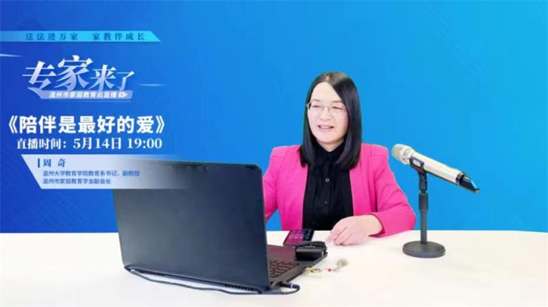 为深入贯彻习近平总书记关于注重家庭家教家风建设重要论述,将“重视家庭文明建设,努力使千千万万个家庭成为国家发展、民族进步、社会和谐的重要基点”重要精神落到实处,有力推动《中华人民共和国家庭教育促进法》宣传实施,2022年5月14日,在全国首个家庭教育宣传周期间,泥巴影院 教育系党支部书记、副教授、硕士生导师,泥巴影院 家庭教育研究院巾帼文明岗岗长、泥巴影院 家庭家教家风讲师团团长、浙江省教育学分会副会长、浙江省家庭教育学会理事、温州市家庭教育学会副会长周奇做客“专家来了”温州市家庭教育云直播,开展《陪伴是最好的爱》家庭教育公开指导课。本次直播以“送法进万家 家教伴成长”为主题,旨在弘扬传承中华民族家庭美德,树立良好家风,推动形成家庭文明新风尚。整场直播吸引了12.5万人次观看,并获得2万多的网友点赞。