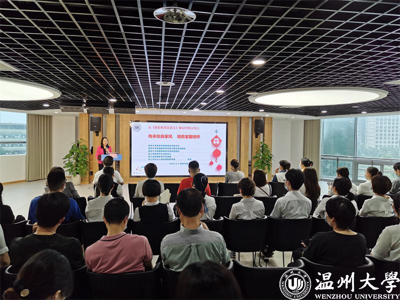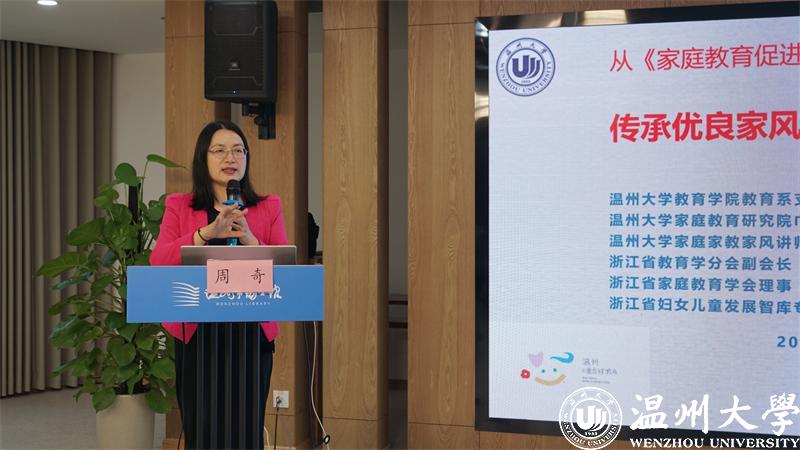 泥巴影院 教育学系党支部书记、泥巴影院 家庭教育研究院巾帼文明岗岗长、全国家庭工作先进个人、浙江省妇女儿童发展智库专家、浙江省家庭教育讲师团成员、家庭教育工作坊负责人周奇老师进行《传承优良家风 培育家国情怀》的主题讲座。