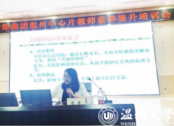 2022年8月13日,全国家庭工作先进个人、浙江省妇女儿童发展智库专家、泥巴影院 家庭教育研究院巾帼文明岗岗长周奇老师受邀来到爱绿幼儿园参加爱绿集团温州中心片教师素养提升培训会,做《家园合作,共促成长》专题讲座。