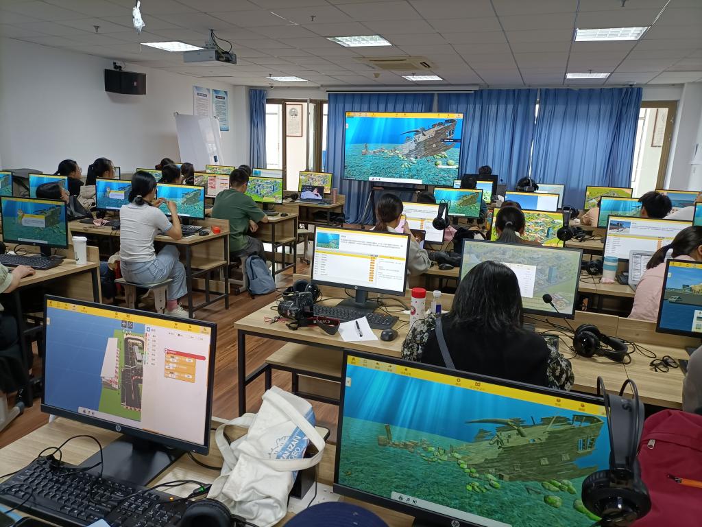 本次培训主要介绍了格灵世界软件的使用和操作,北京格如灵科技有限公司工程师从课程设计理念出发总体介绍了格灵世界课程体系,以智能海港馆《海港建设者》为例,向大家演示了如何操作使用格灵世界软件。技术人员现场指导大家上机练习开发制作新作品、导入头盔一体机、体验自己开发的创意作品。师生积极参与其中,并就场馆资源开发、教研设计等问题与工程师进行了深入讨论。